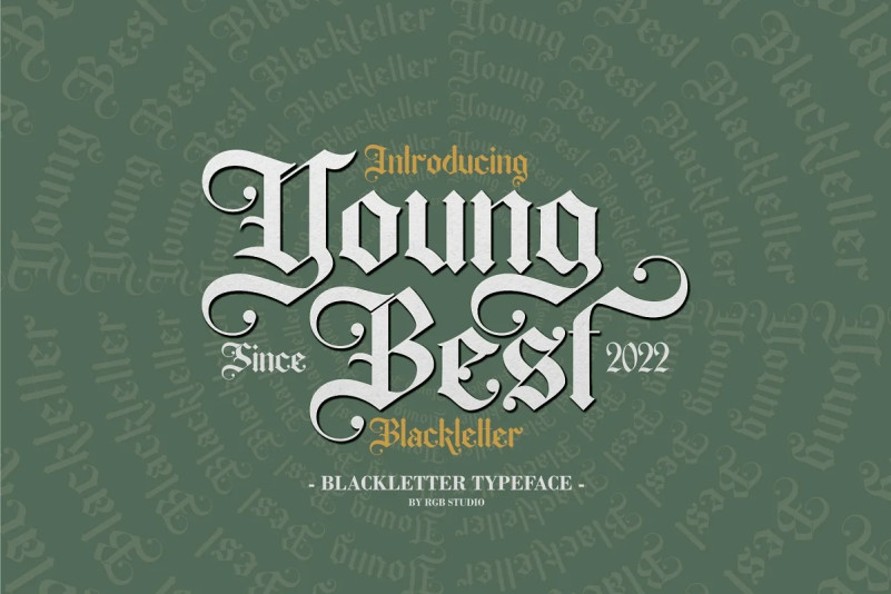 Young Best Blackletter Font is a bold, distinct and elegant blackletter typeface crafted & designed by RGB Studio. Supported by alternative options such as swash and alternative characters, making Young Best font very easy to create designs with strong or dark themes. In addition, Young Best font is also supported with multilingual characters that can be used in several international languages.